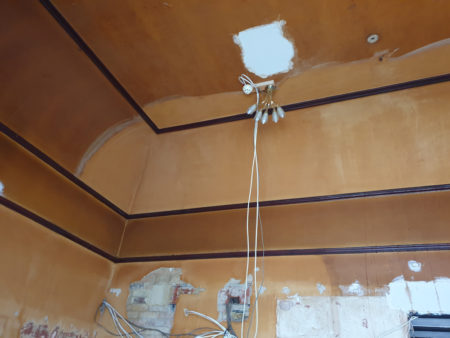 The were a lot of holes in the ballroom ceiling and they are slowly being filled with plaster. The walls have been damaged quite extensively and will probably need a skim, but most of the brown coloured ceiling above is in good condition apart from a few holes. The ceiling wasn’t brown originally – the colour is from a century of tobacco smoke.